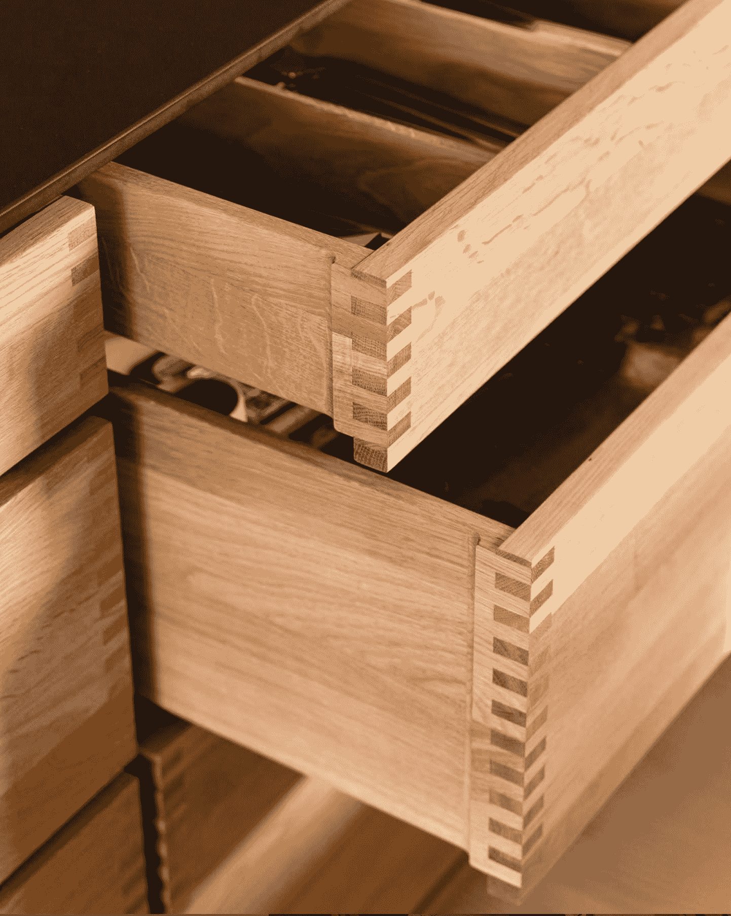 Det giver dig en helt særlig æstetisk nydelse, hver eneste gang du åbner skuffen. Her kan du vælge samme trætype eller farve som fronterne, men det er også flot med kontraster som f.eks. lyse skuffer til mørke træsorter.