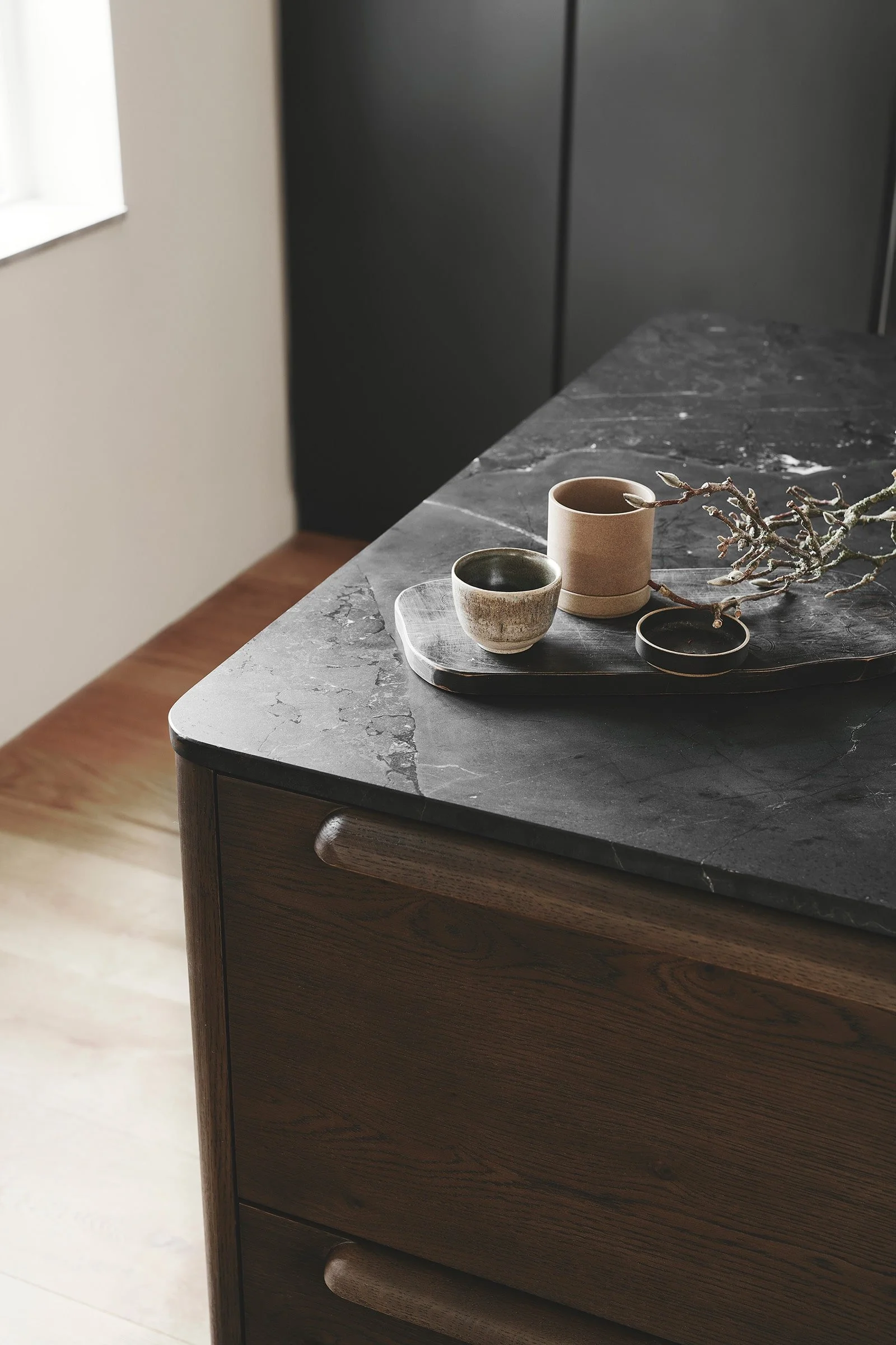 I samarbejde med interiørstylist, art director Monica Cetti har Køkkensnedkeren udviklet et køkkendesign med fokus på ro og harmoni. Et køkken i mørkt træ med runde greb, der naturligt indpasser sig i boligen.