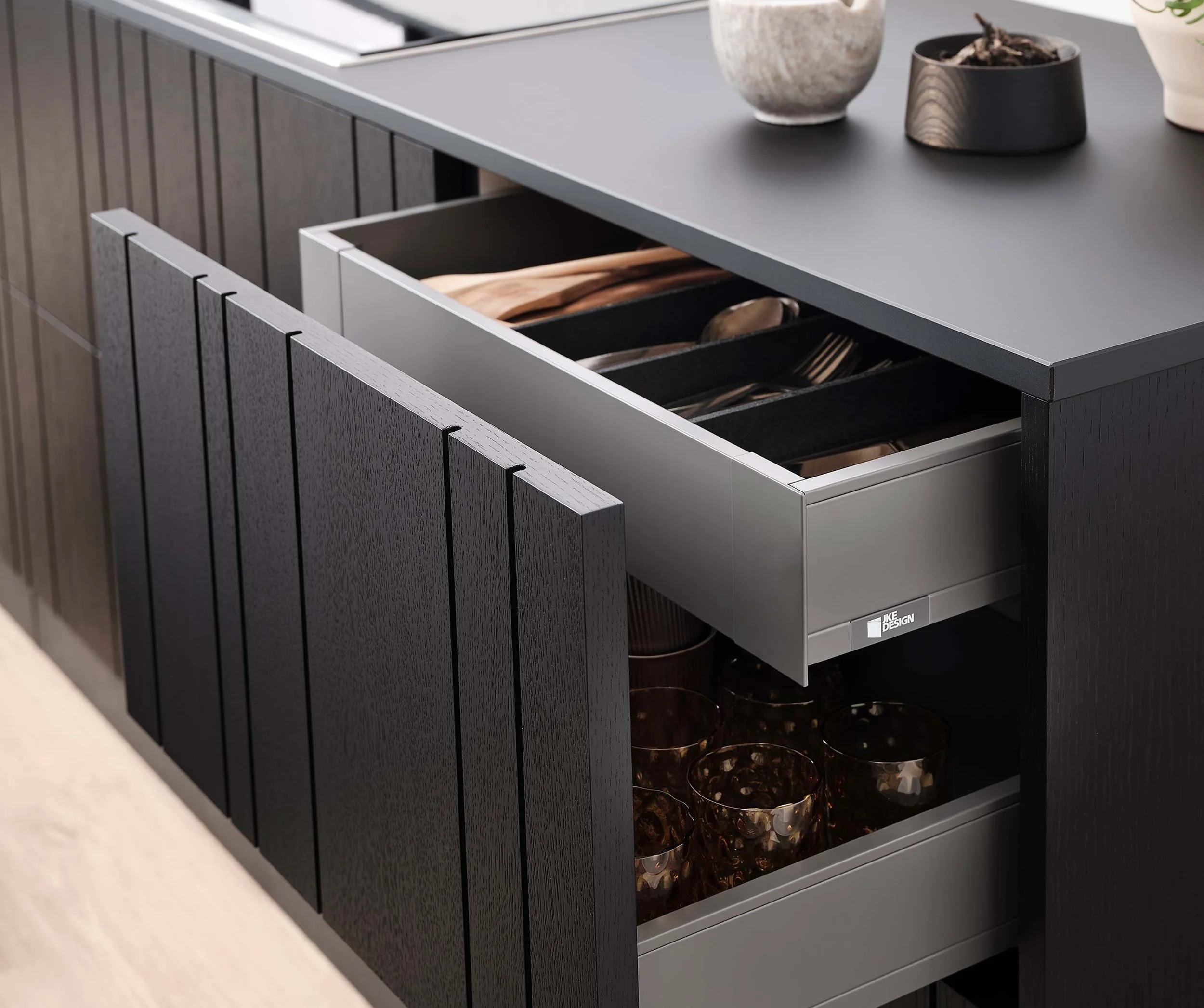 Skovens mangfoldighed har inspireret til køkkendesignet, Nordic Woodlands, som er blevet til i et stærkt samarbejde mellem JKE og arkitektfirmaet Njordrum. En fælles passion for træ, bæredygtighed og nordisk design ligger bag udtrykket.