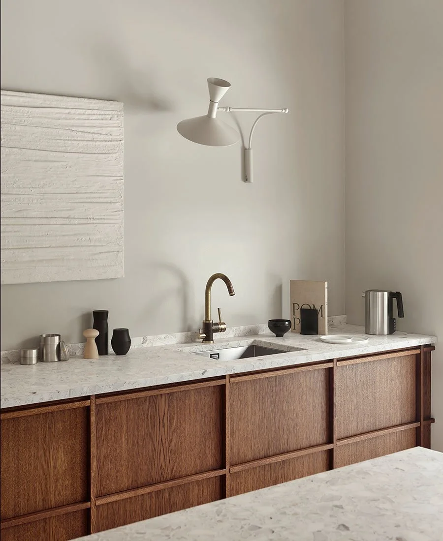 De varme træfronter får fornemt modspil fra de lyse terrazzoplader, som beklæder køkkenbord og køkkenø. Valget af tilbehør – messingarmatur og – vask understreger sammen med den skulpturelle Le Corbusier lampe og udvalgte accessoires i keramik, træ og stål det eksklusive udtryk.