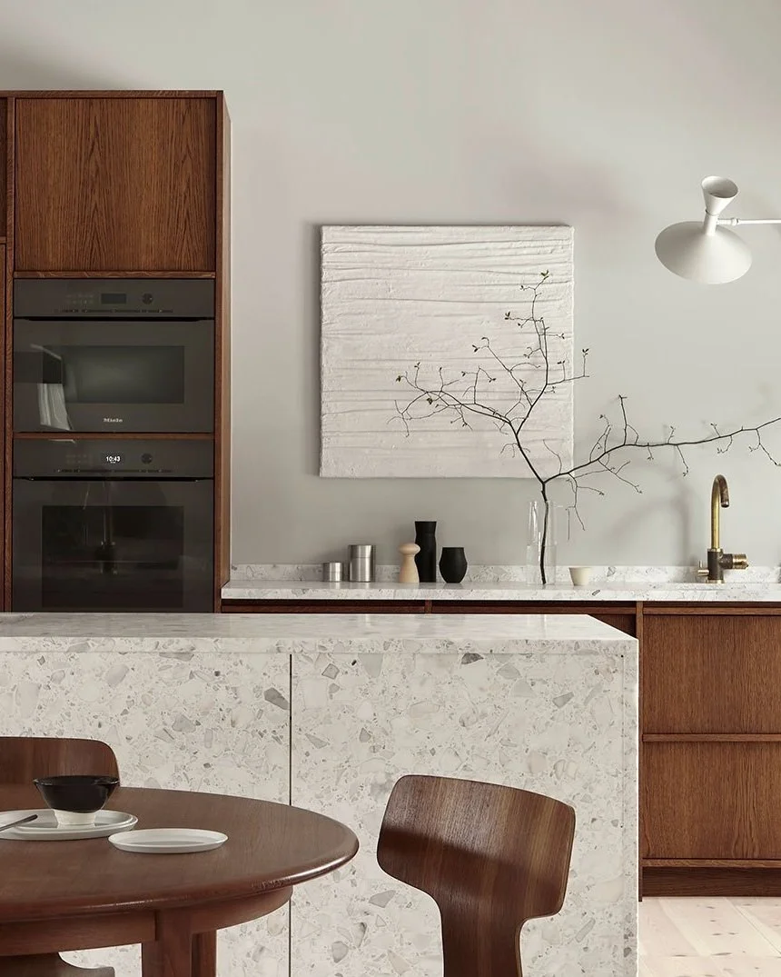 Den smukke bordplade, spiller i varme toner, i Terrazzo Calacatta. Køkken + Foto: Nordiska Kök