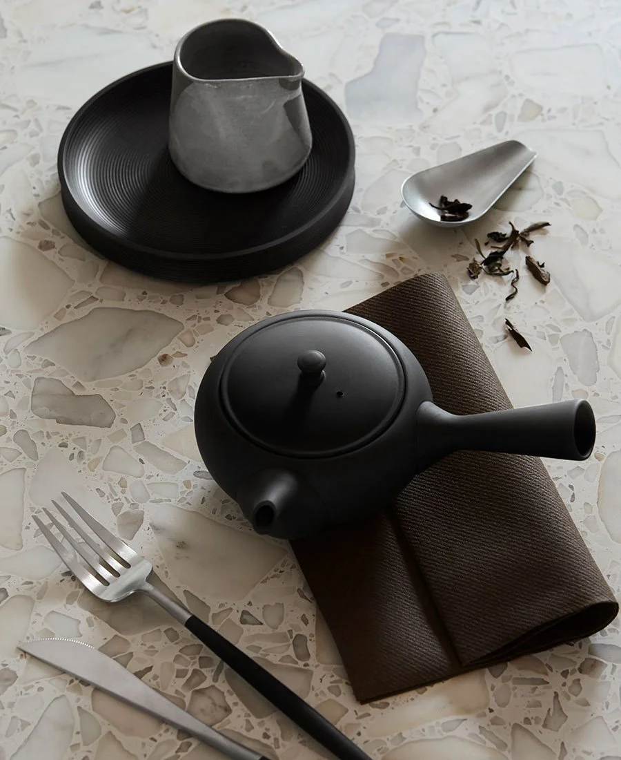Mørke køkkenelementer, lyse terrazzo bordplader og beklædning på køkkenøen skaber sammen med mørke spisestuestole og bord et stemningsmættet og indbydende køkkenalrum. Køkken og foto: Nordiska Kök