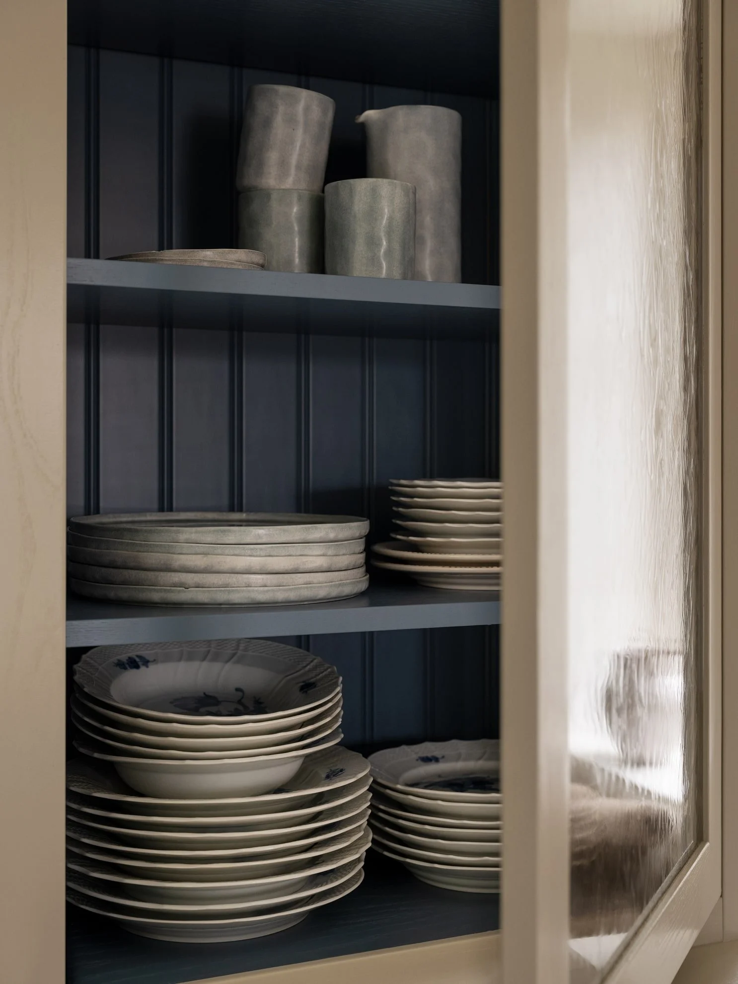 Vitrineskabets indvendige, blå kontrastfarve fremhæver det smukke porcelæn. Foto: Nordiska Kök