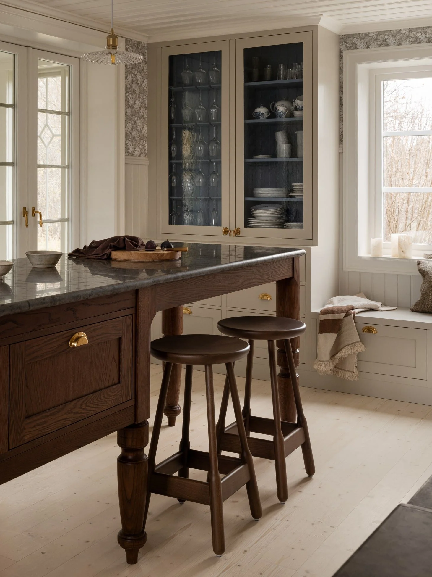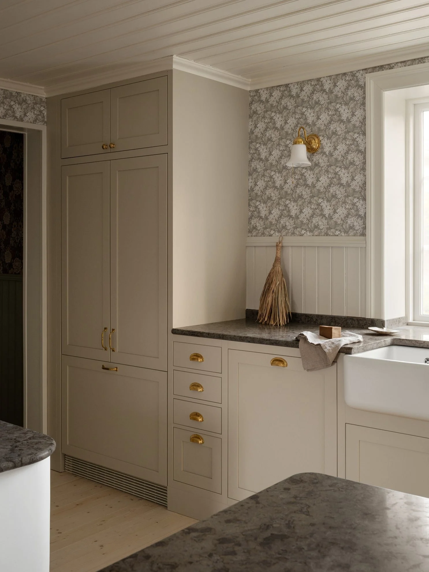 Køkkenet er snedkereret af massivt træ, som er håndmalet på stedet. En lys, cremefarve er den klare, gennemgående nuance – på køkkenfronter, døre, vægpaneler og det fine, mønstrede tapet. I midten af rummet ses køkkenøen i mørk eg med klassiske messingdetaljer, designet til at matche husets oprindelige arkitektur.