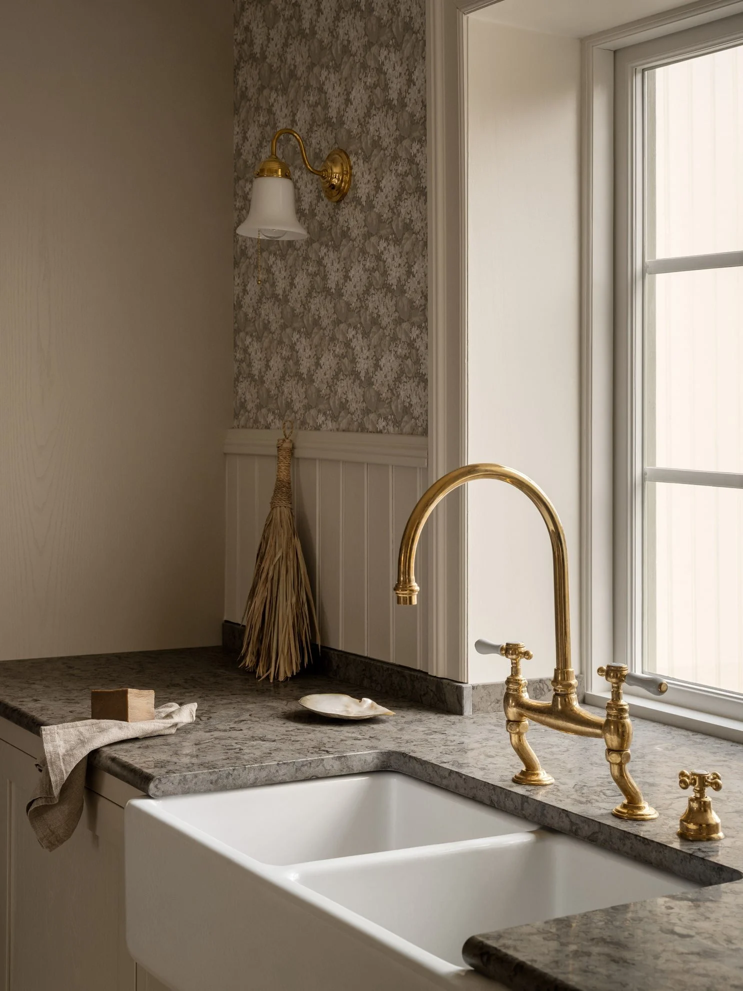 Gennemførte detaljer som porcelænsvasken, messinggrebene, det mønstrede tapet og lamperne giver den autentiske oplevelse. Foto: Nordiska Kök