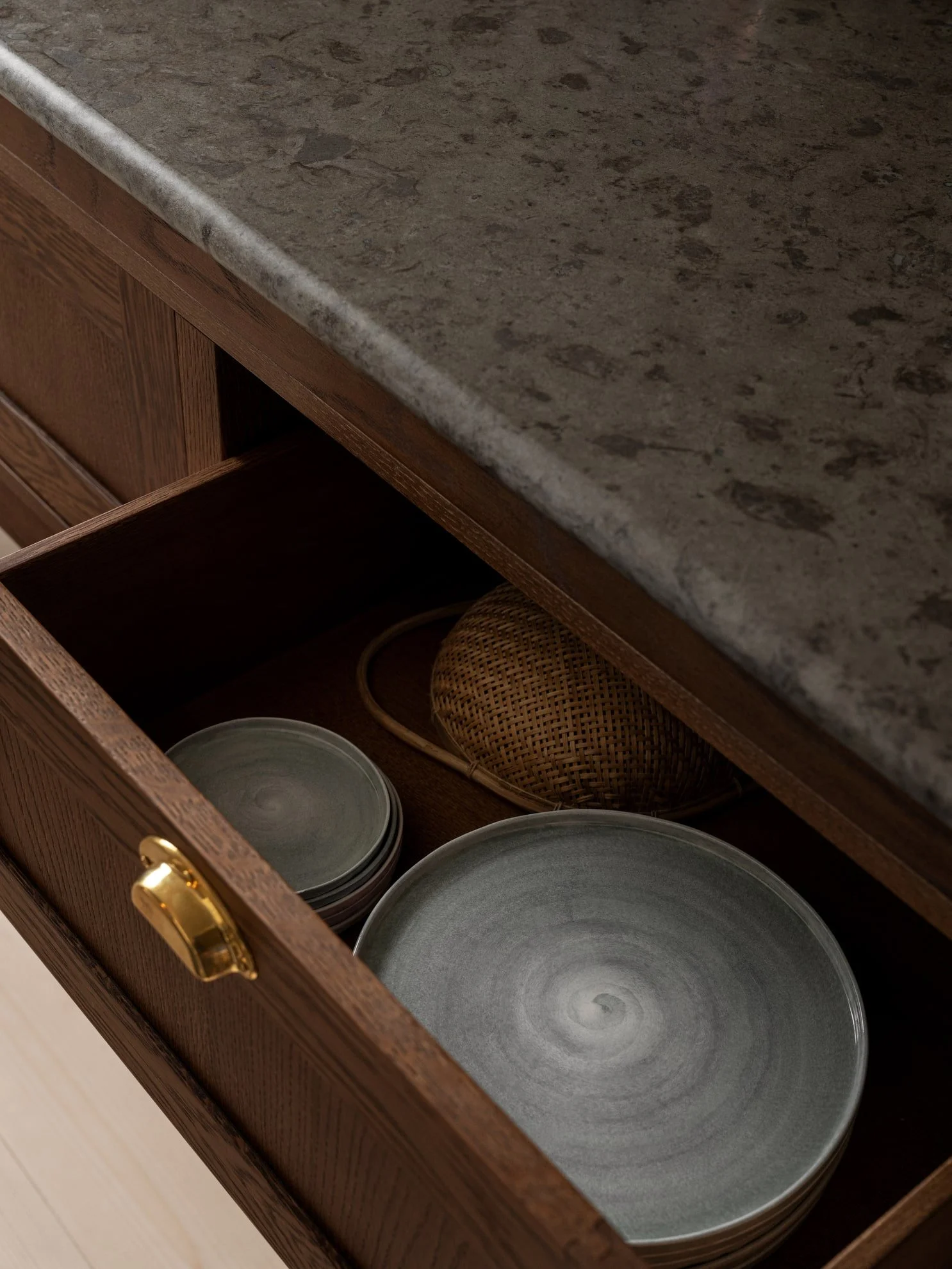 Shaker-stilen, snedkerhåndværket, messingdetaljerne, de lyse farver, de udsøgte materialer og helt centralt den mørke køkkenø – alt klinger og spiller sammen fra de store linjer til de mindste detaljer i køkkenet i det fine, gamle landsted i den stockholmske skærgård. Et landkøkken anno 2024, der næsten kunne have været det originale.