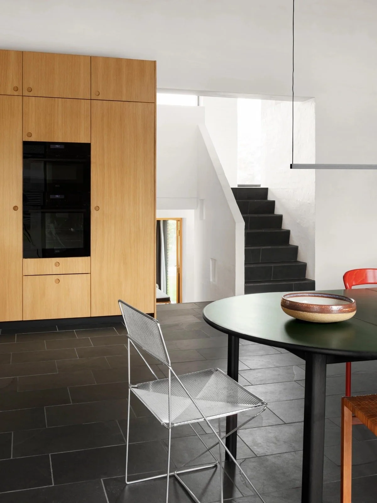 Køkkenelementerne er Reforms BASIS-design i natureg med Reform-kabinetter i egetræslaminat og skuffer i massiv eg samt bordplader i rustfrit stål. Det enkle design, de rene linjer samt kontrasterne og varmen fra egetræet giver en harmonisk sammenhæng i det fuldmurede 70’er hus.