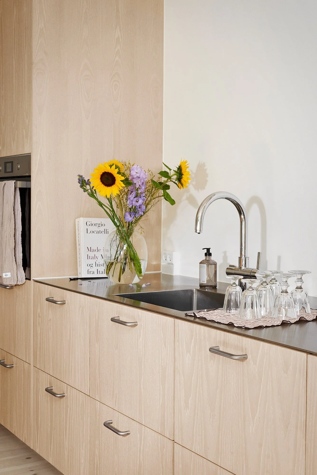 Wood-kollektionen fra &Shufl i lyst asketræ får et køligt, eksklusivt udtryk, når det kombineres med stål – i bordplade, vask og armatur. Foto: &Shufl