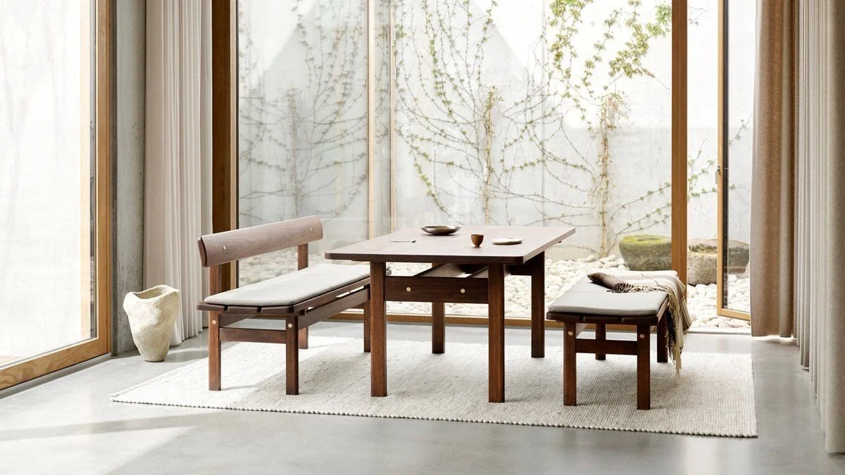 Børge Mogensen tegnede i 1961 en serie enkle møbler til sit eget sommerhus - en bænk og et spisebord, som nu lanceres i en nutidig version i mørkolieret eukalyptus træ, der er FSC-certificeret.