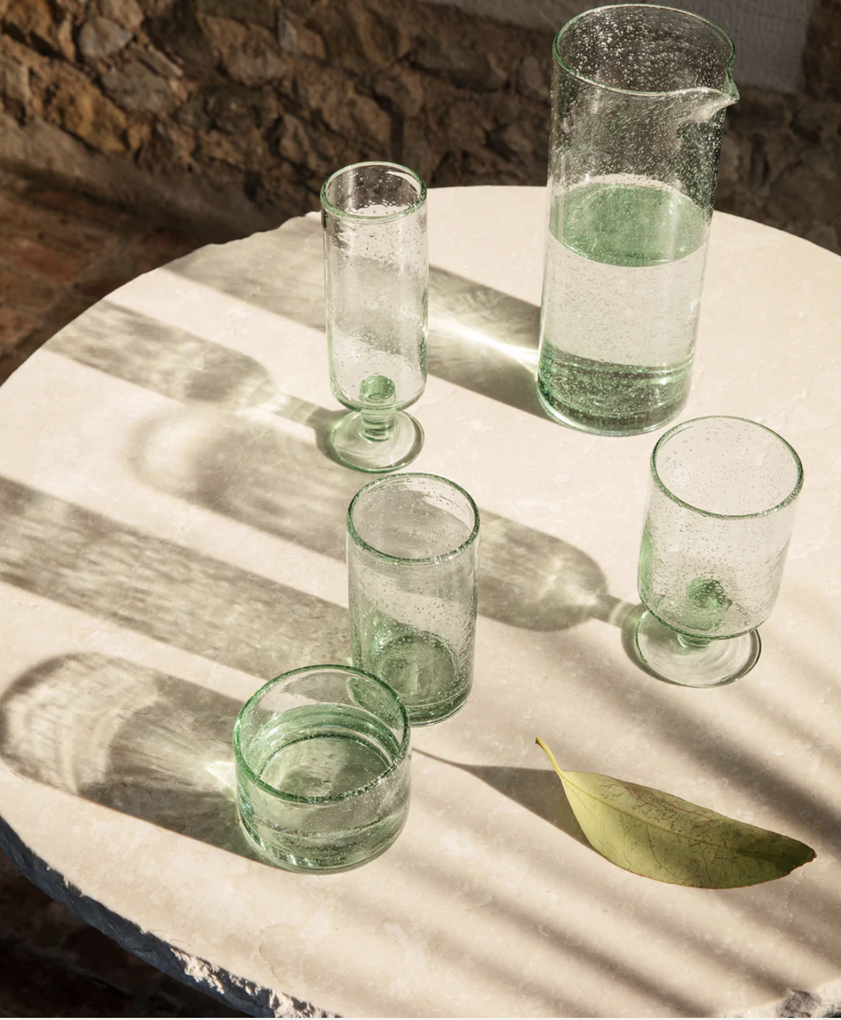 ferm Living bringer de gode vibes til vores nordlige del af kloden med en ny serie af mundblæste glas fremstillet af 100 procent genbrugsglas. Bittesmå bobler ses i glasset, der fremstår i genbrugsglassets naturlige farver.