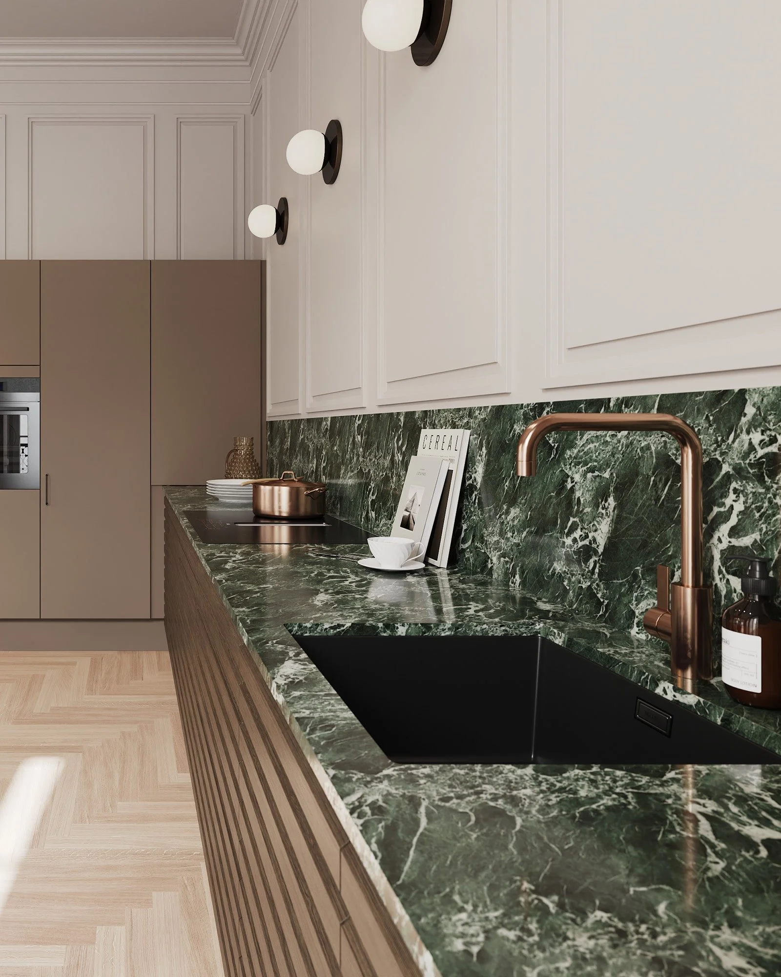 Sandfarvede højskabe kombineres med de chokoladefarvede fronter og det grønne marmor. Køkken + Foto: AUBO