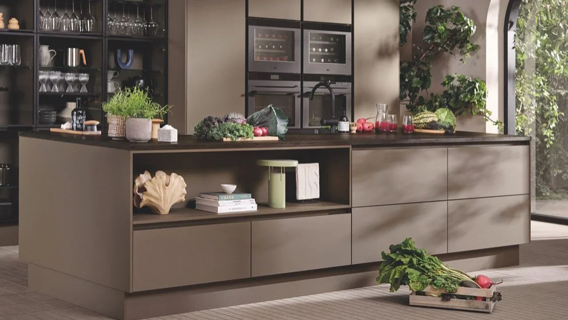 Nordic Root kombinerer den gråbrune jordfarve på fronterne med bordplade i massivt, sort egetræ. Foto: HTH