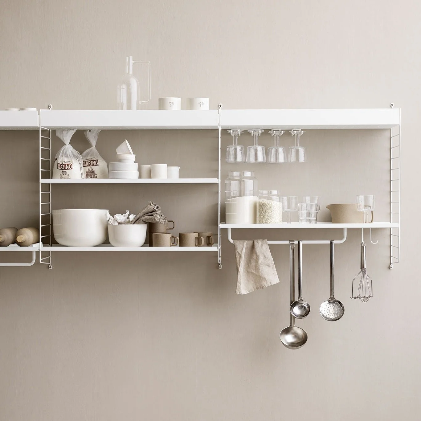 EN HVIDE String-reol er både enkel, uhøjtidelig og multifunktionel. Det er nemlig et system med mange features, så du kan skabe din egen custom-made-reol med bl.a. vinglasholdere, knivblokke, bokse og kroge.