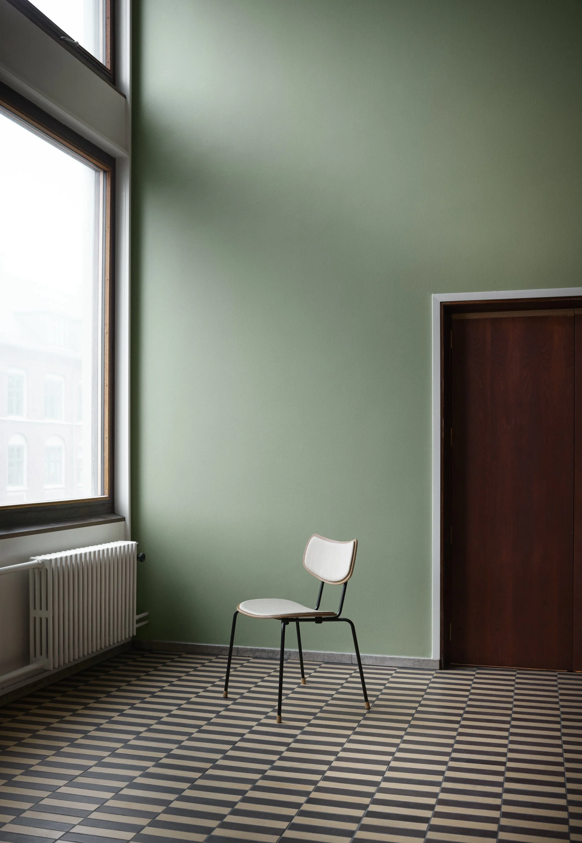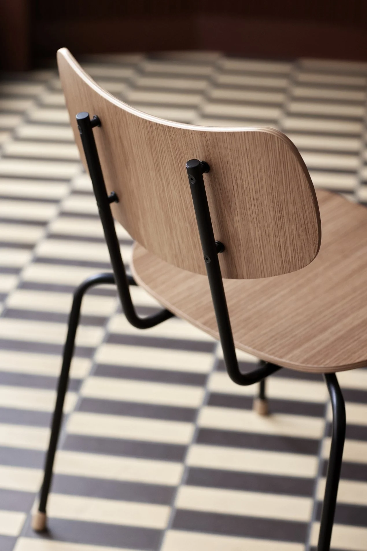 Vilhelm Lauritzens fine fornemmelse for de små detaljer kommer til udtryk i den stabelbare stol med sort stålstel samt ryg og sæde i formspændt egetræsfiner. En stol med et minimalistisk udtryk, funktionalisme i et rent og klart formsprog. En lidt blødere version fås med betræk på sæde og ryg.
